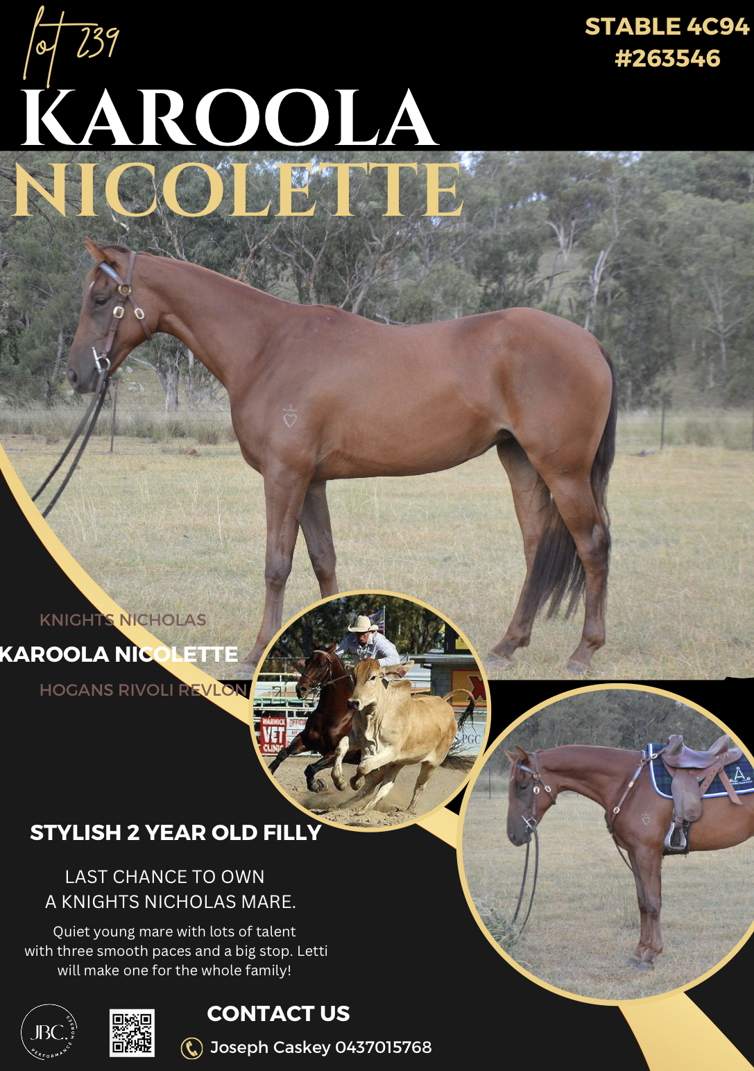 By the Sire that needs no introduction KNIGHTS NICHOLAS and out of RIVOLI RAY mare hogans rivoli revlon. Letti is a very well balanced young mare who has established 3 even paces in a collected and loose rein. Letti would excel in the show, challenge and Campdraft ring making her a very strong contender for the 25 Classic incentives.