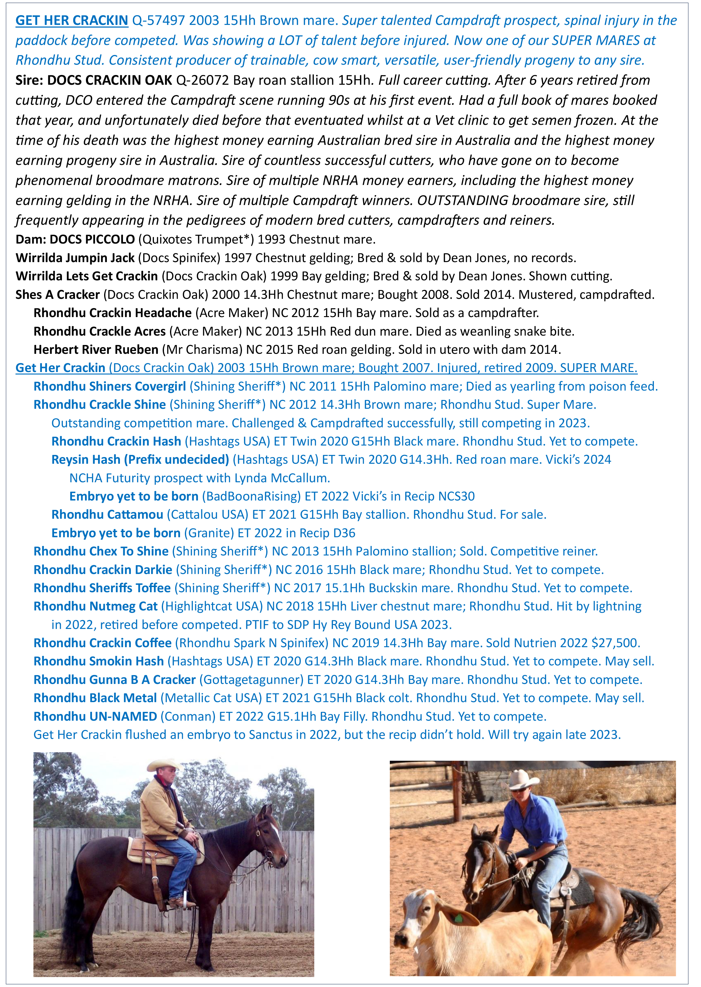 SUPERLATIVE COLT. Not even 2yo! SYNDICATE MATERIAL. Performance/Stud prospect. Elegant. Athletic. Super intelligent. Outstanding type. Growthy. Influential sire. Stellar dam; one of our most successful mare lines. ½ siblings by Shining Sheriff*/Hashtags*/BadBoonArising*/Gottagetagunner/Highlightcat*/Conman all competing/in-training for Challenges/Campdrafts/Cutting/Reining. Extensive dam history> Nutrien-Equine.
