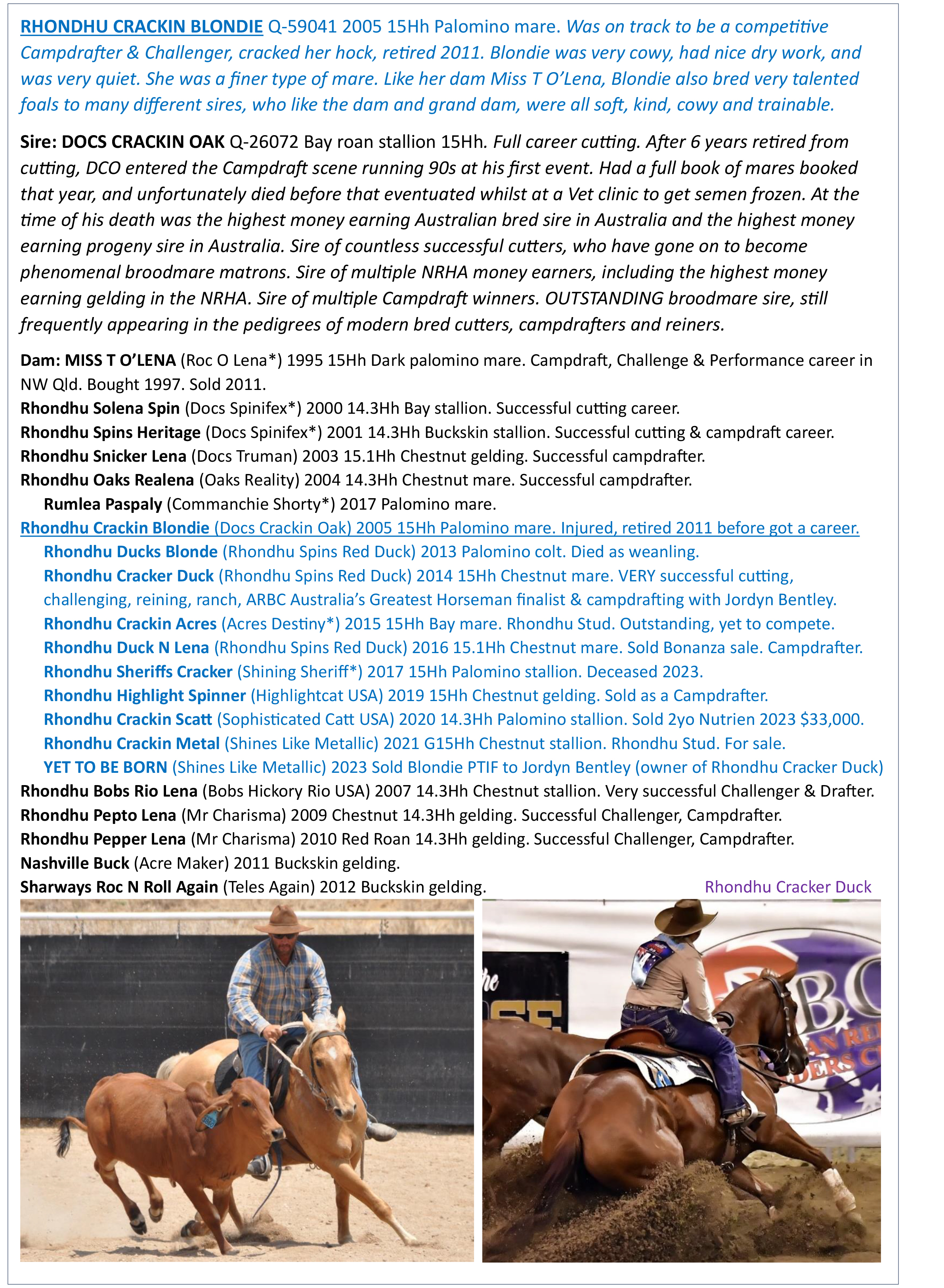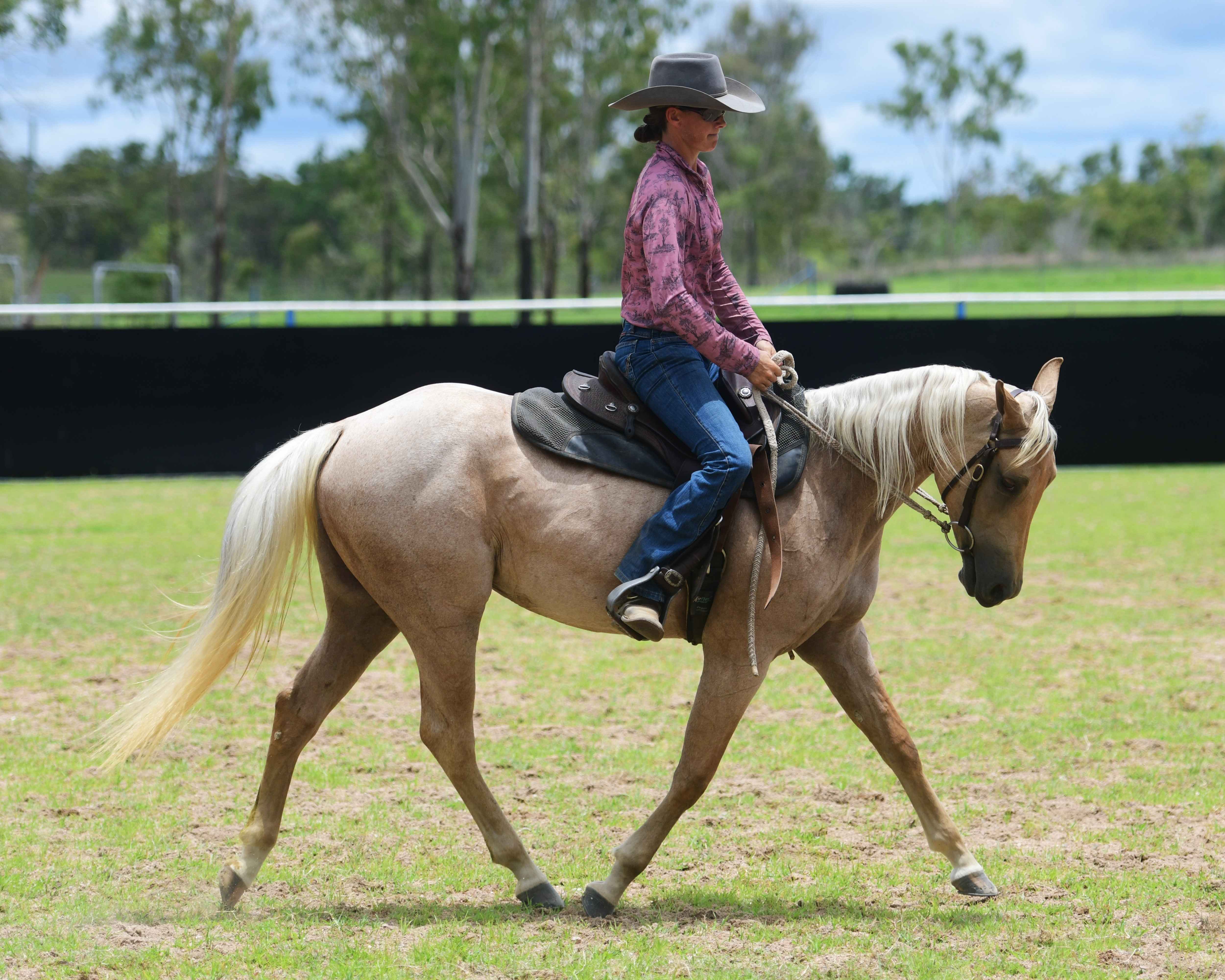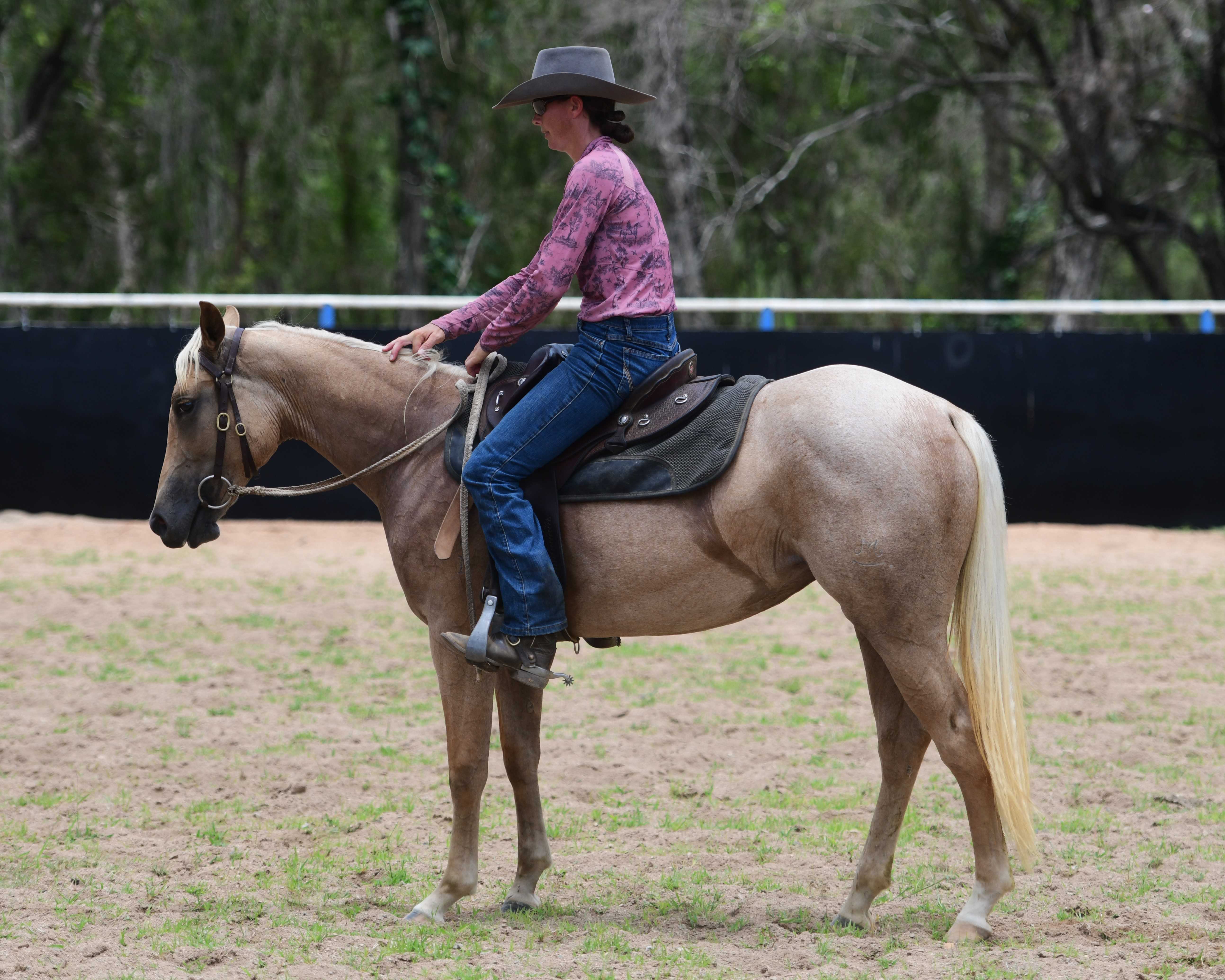 Eye-catching, trainable, athletic filly, barely 2yo, by popular sire & stalwart cutter Shines-Like-Metallic. Would suit any Cow Horse sport. Enviable bottom line. Dam & grand-dam have MANY proven progeny, including Rhondhu-Cracker-Duck (Jordyn Bentley's) highly successful ARBC/Cutting/Reining/Ranch/Challenges. Extensive dam history> Nutrien-Equine.