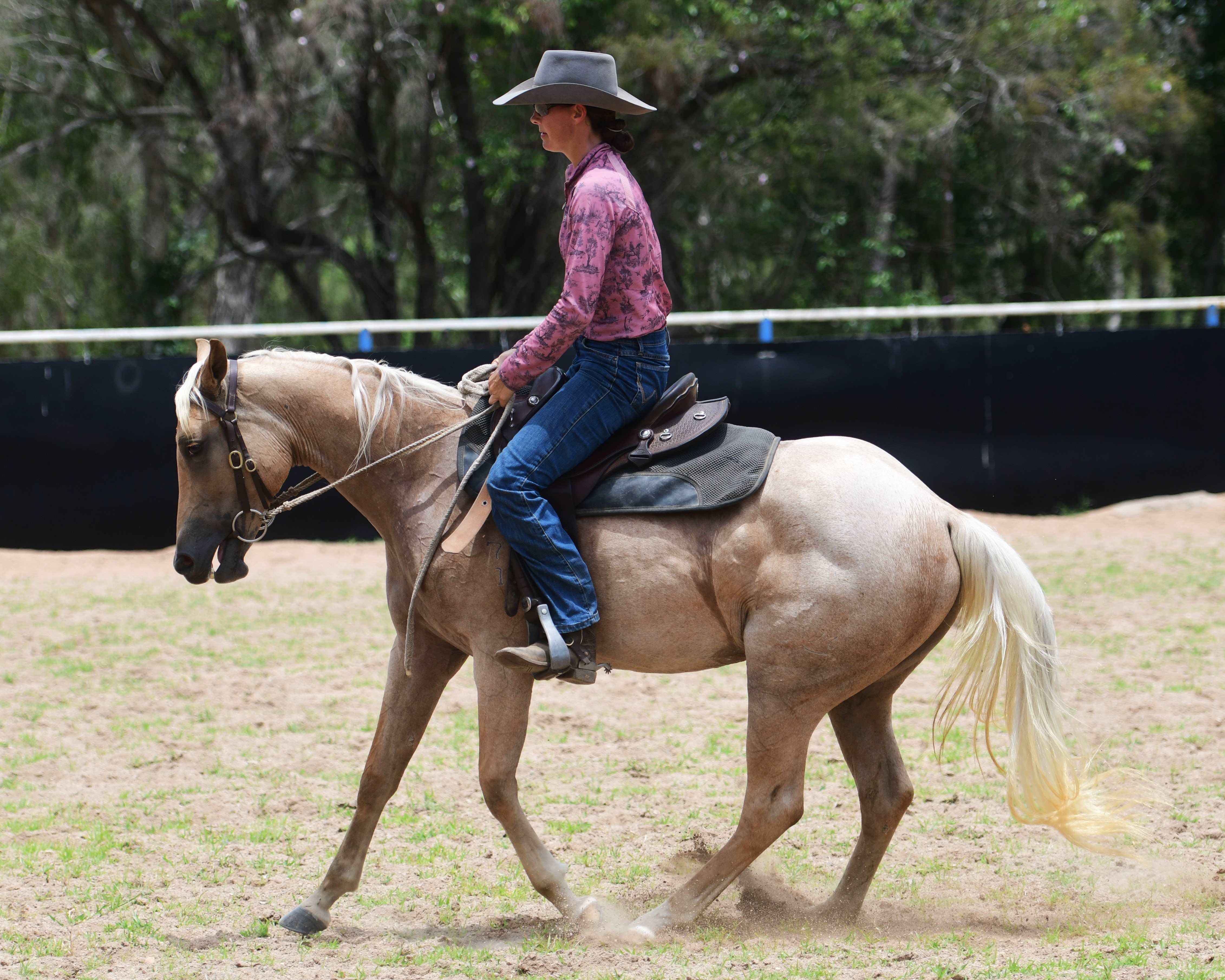 Eye-catching, trainable, athletic filly, barely 2yo, by popular sire & stalwart cutter Shines-Like-Metallic. Would suit any Cow Horse sport. Enviable bottom line. Dam & grand-dam have MANY proven progeny, including Rhondhu-Cracker-Duck (Jordyn Bentley's) highly successful ARBC/Cutting/Reining/Ranch/Challenges. Extensive dam history> Nutrien-Equine.