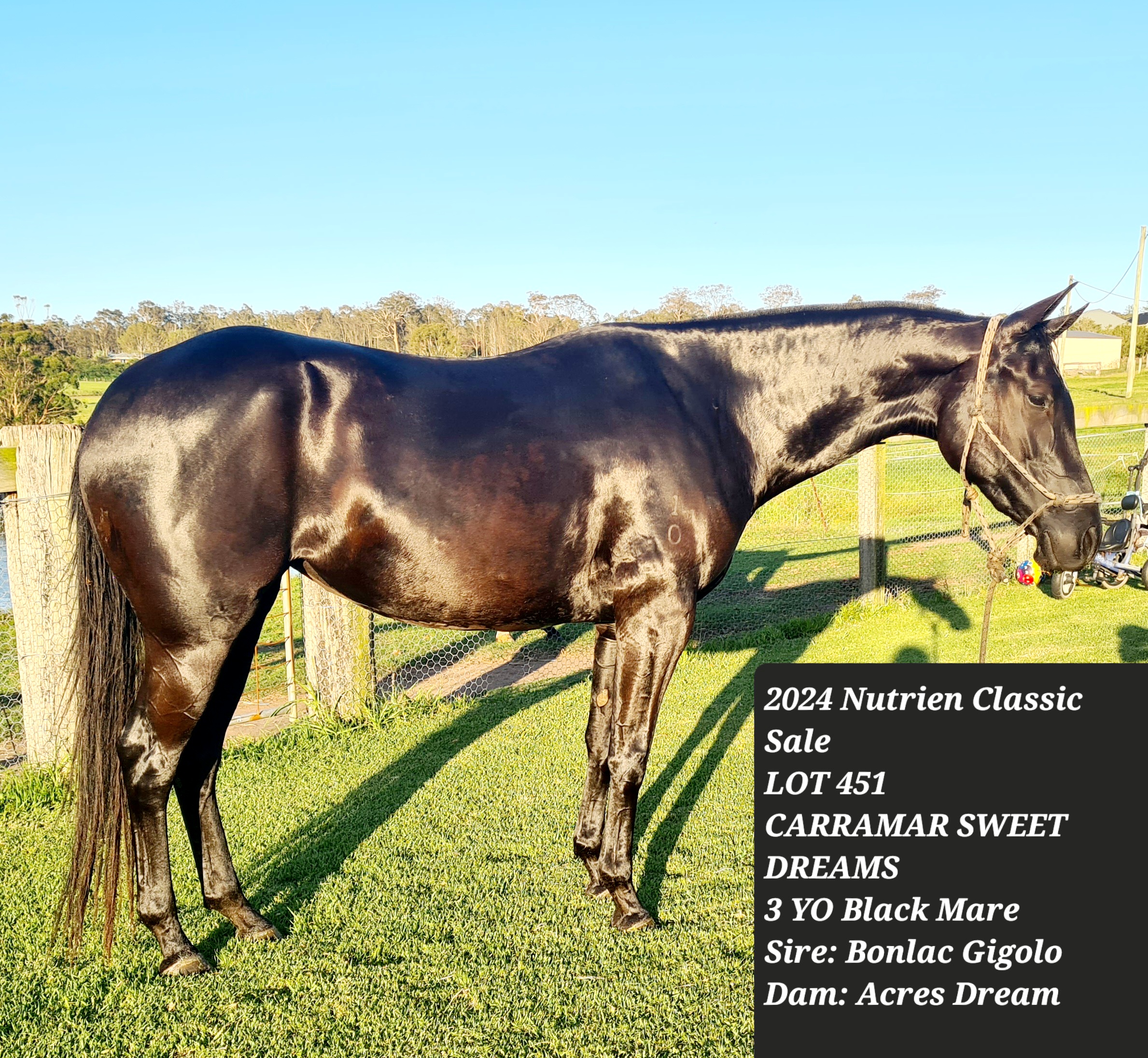 Beautiful black Gigolo/Acres mare. Grand dam Playtime multiple open campdraft and cutout winner and futurity finalist at Tamworth and Toowoomba. Playtime's full sister Freckles also multiple open draft and cut out winner. Contact Luke on 0428134891