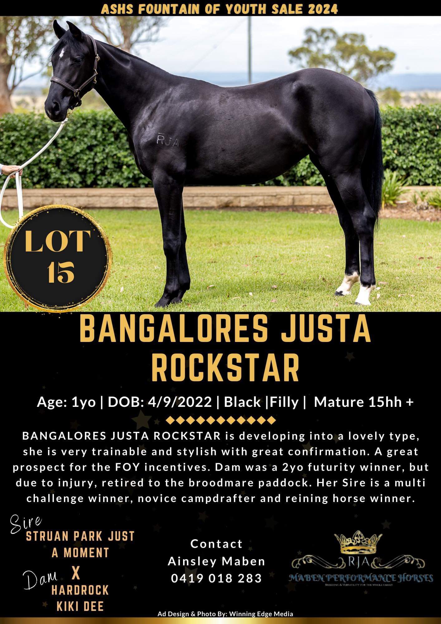 BANGALORES JUSTA ROCKSTAR is developing into a lovely type. Dam was a 2yo futurity winner, but due to injury, retired to the broodmare paddock. Sire is a multi challenge winner, novice campdrafter and reining horse winner.