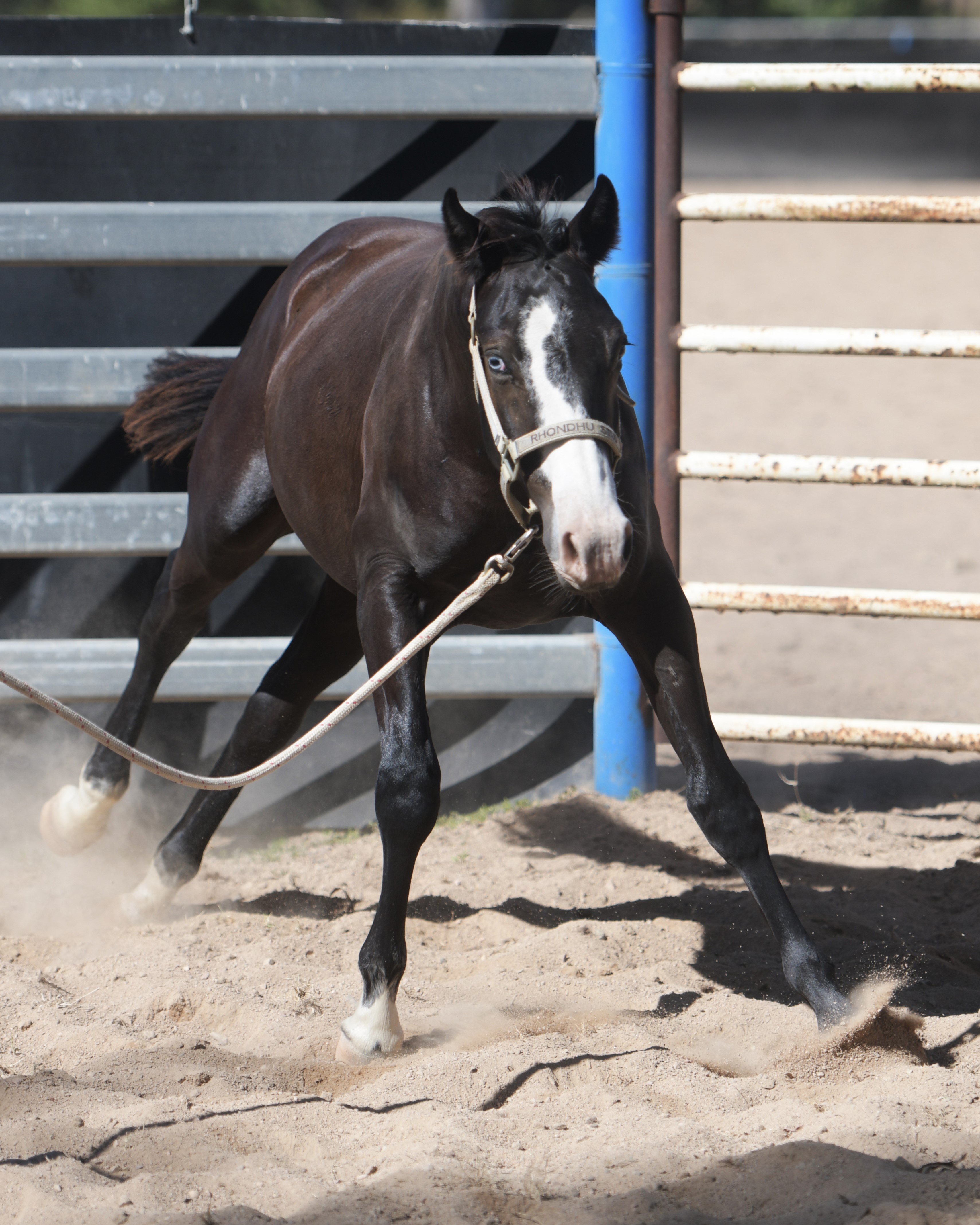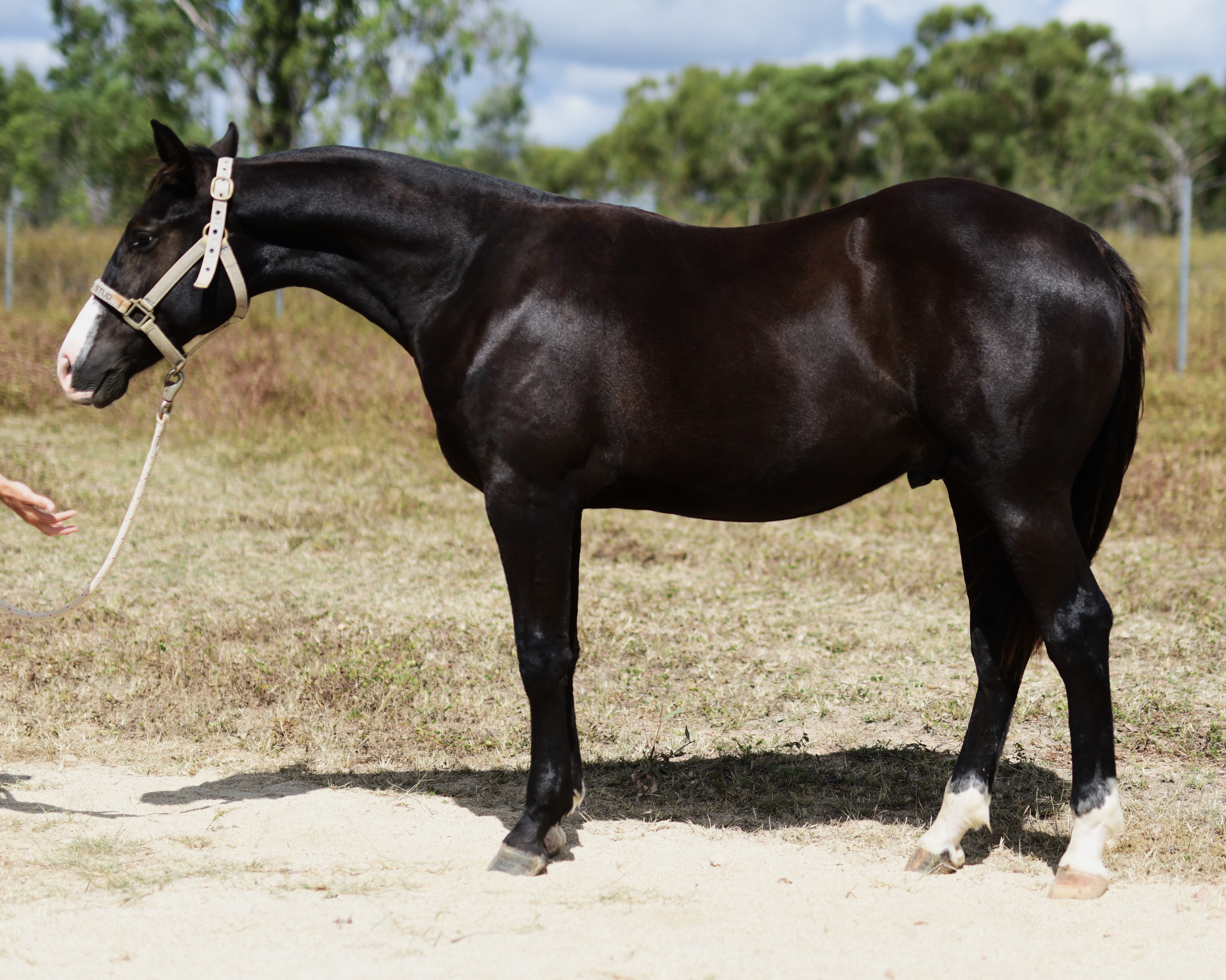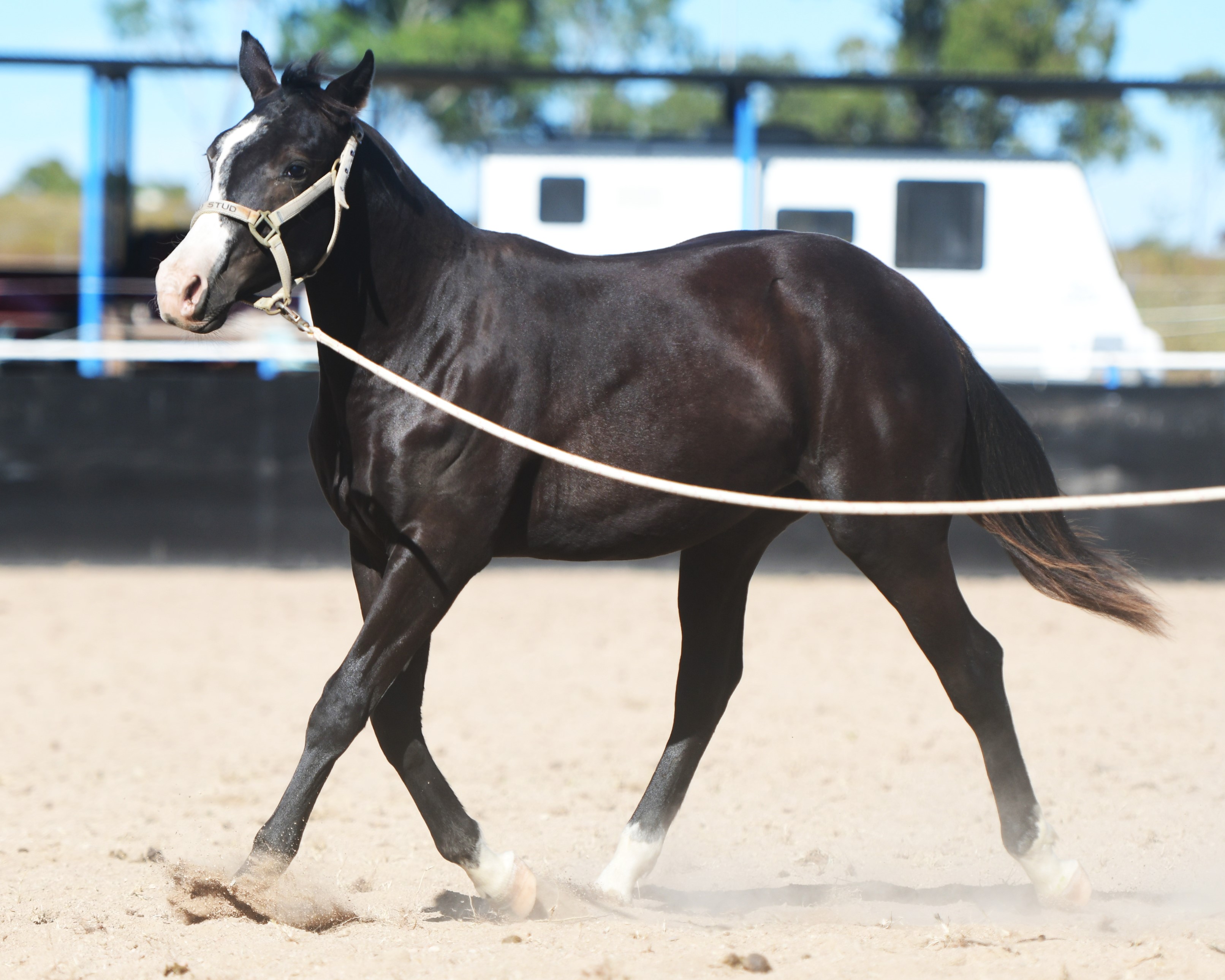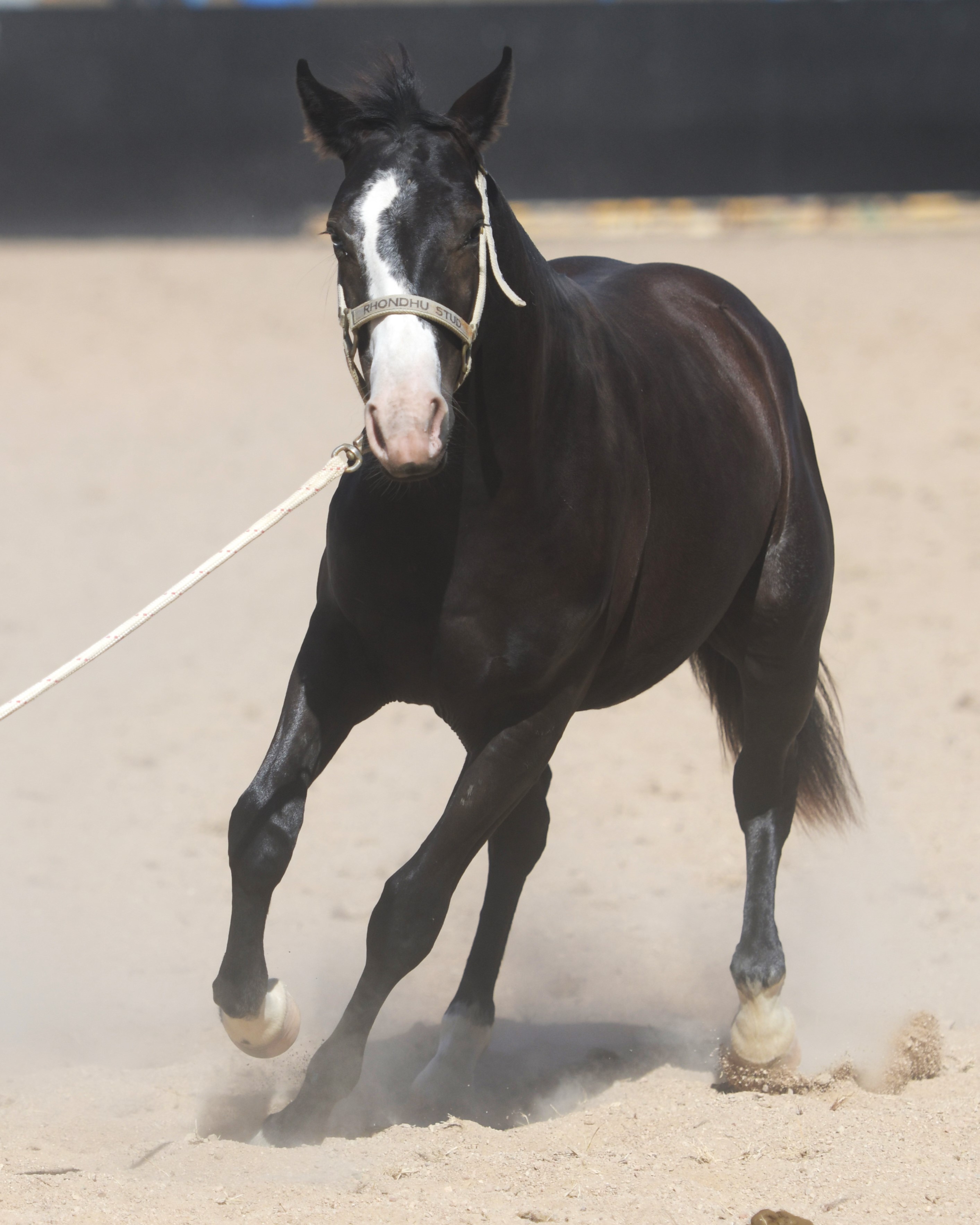 Superlative colt, right here, right now, ready to fire! Everything is right. Embryo transfer BBR live on the ground. Black. One blue eye. Nicely marked. Perfect legs. Perfect feet. Will grow out. Athletic. Savvy. Lots of caution. Amazing pedigree. Top shelf mare line. USA sired that it is rumoured the service fee will be at $18,000 within 2 years, if AUS even gets semen after next season.