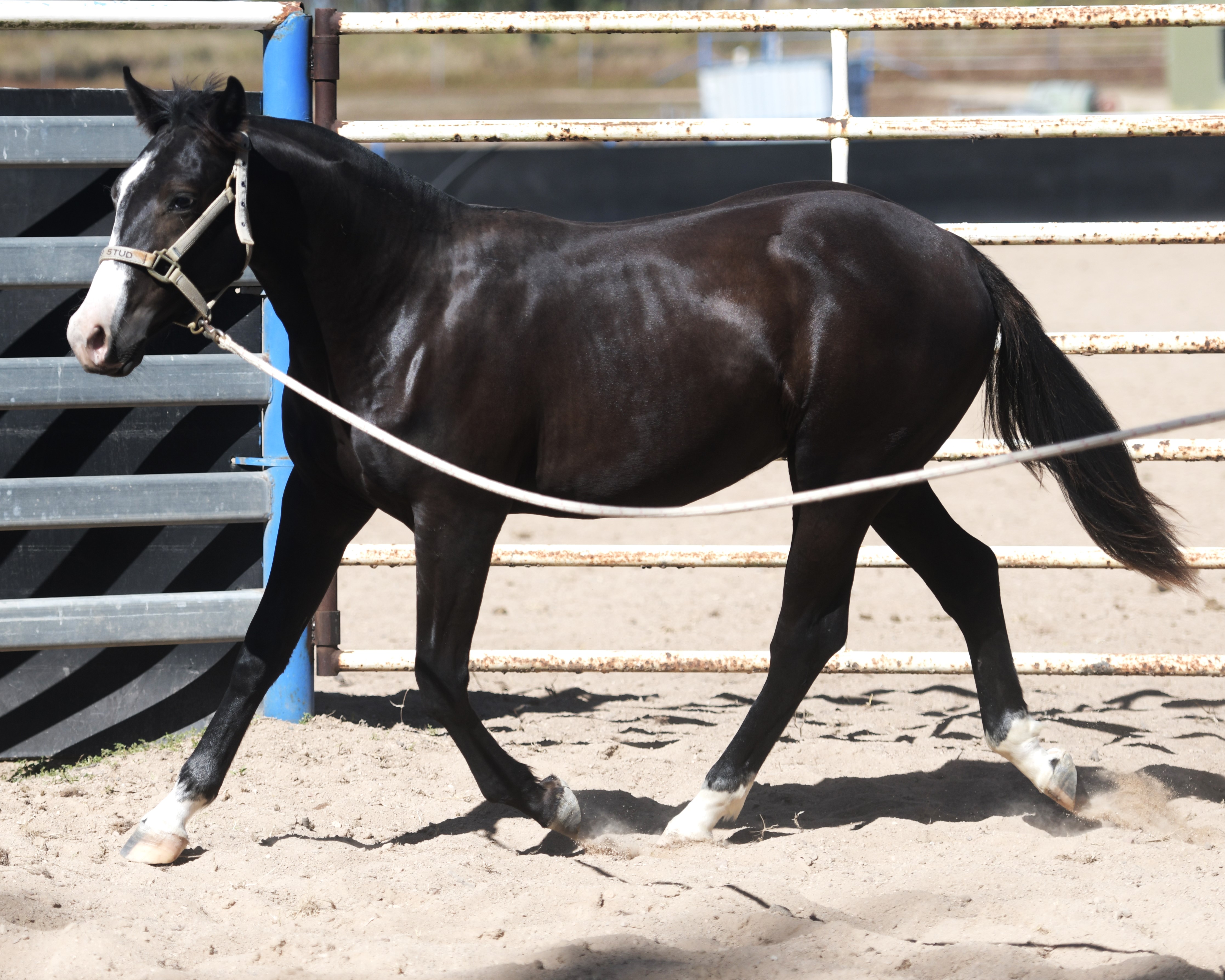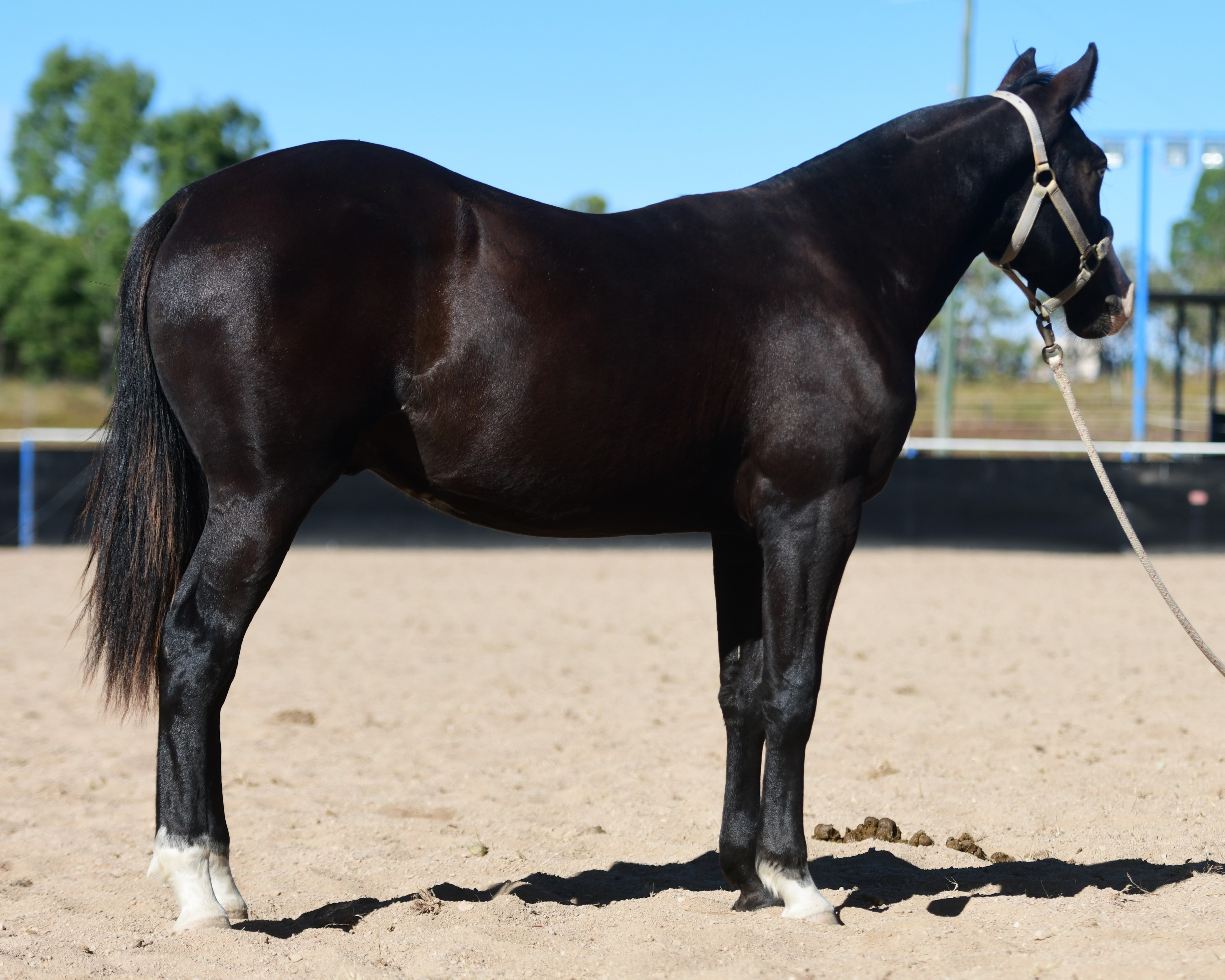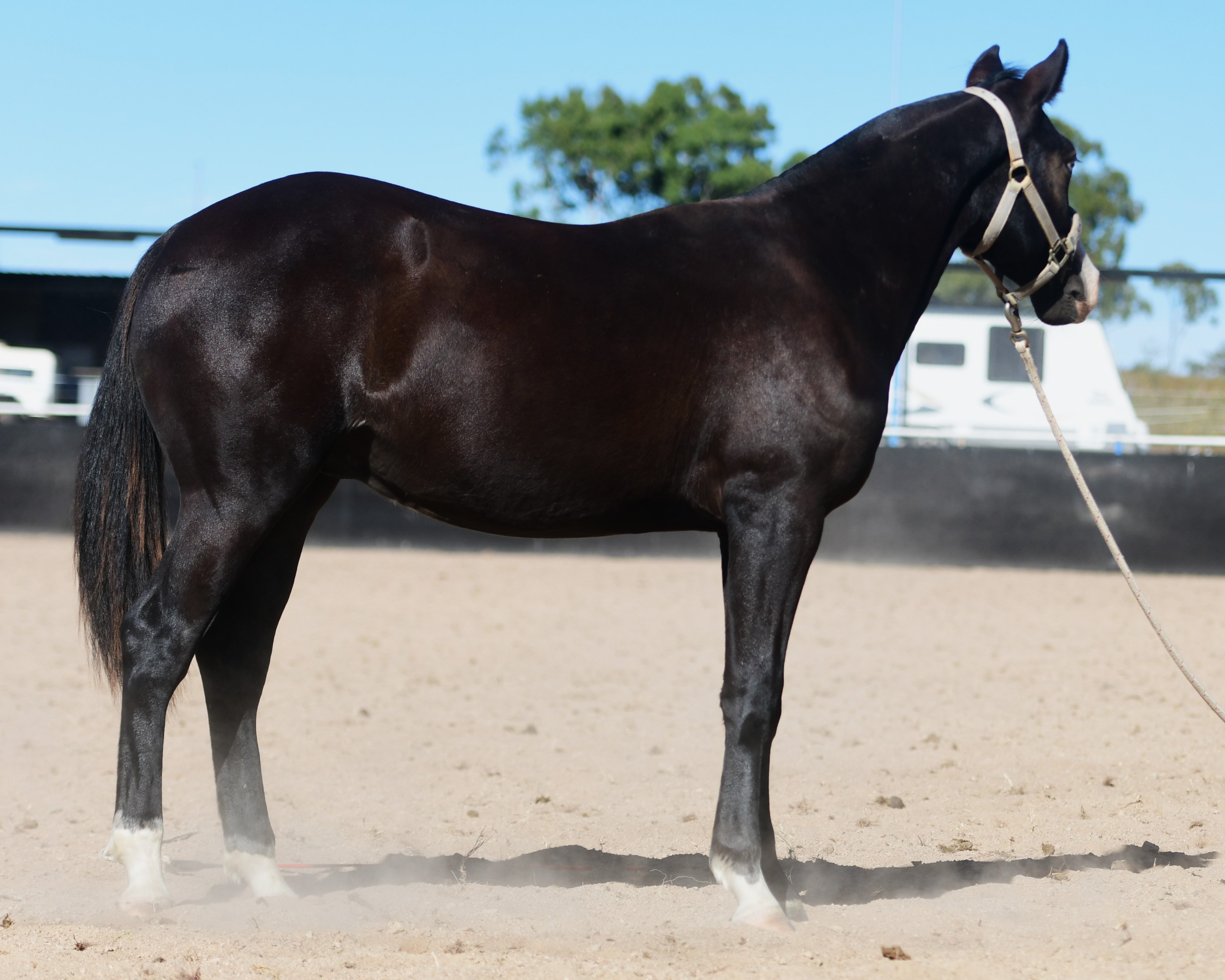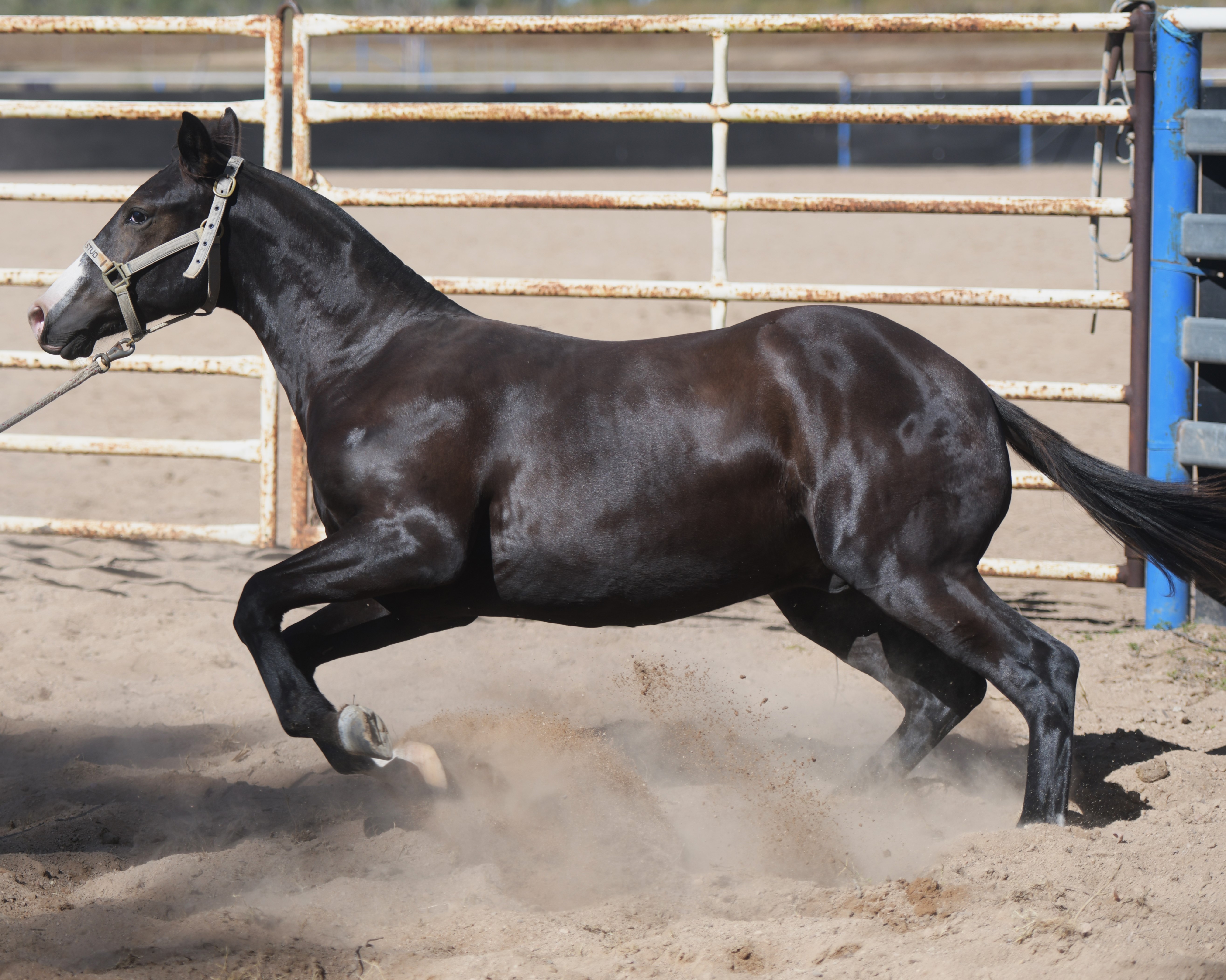 Superlative colt, right here, right now, ready to fire! Everything is right. Embryo transfer BBR live on the ground. Black. One blue eye. Nicely marked. Perfect legs. Perfect feet. Will grow out. Athletic. Savvy. Lots of caution. Amazing pedigree. Top shelf mare line. USA sired that it is rumoured the service fee will be at $18,000 within 2 years, if AUS even gets semen after next season.