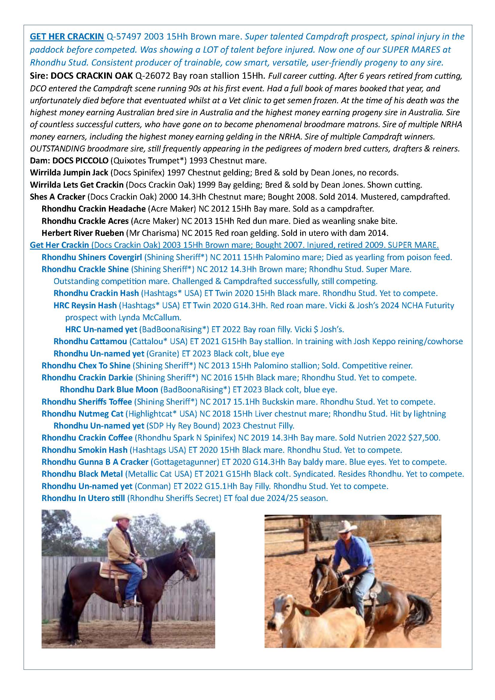 Get Her Crackin is a super mare. She is the dam of so many TOP SHELF progeny now it's becoming exciting. Most of them are very young yet, but every damned one of them is outstanding. Scroll through the photos, READ the pedigree form on the mare family. Then google what Shining Spark and his dam have done in the States. Another family that tops the leaderboards in near any sport you choose.
