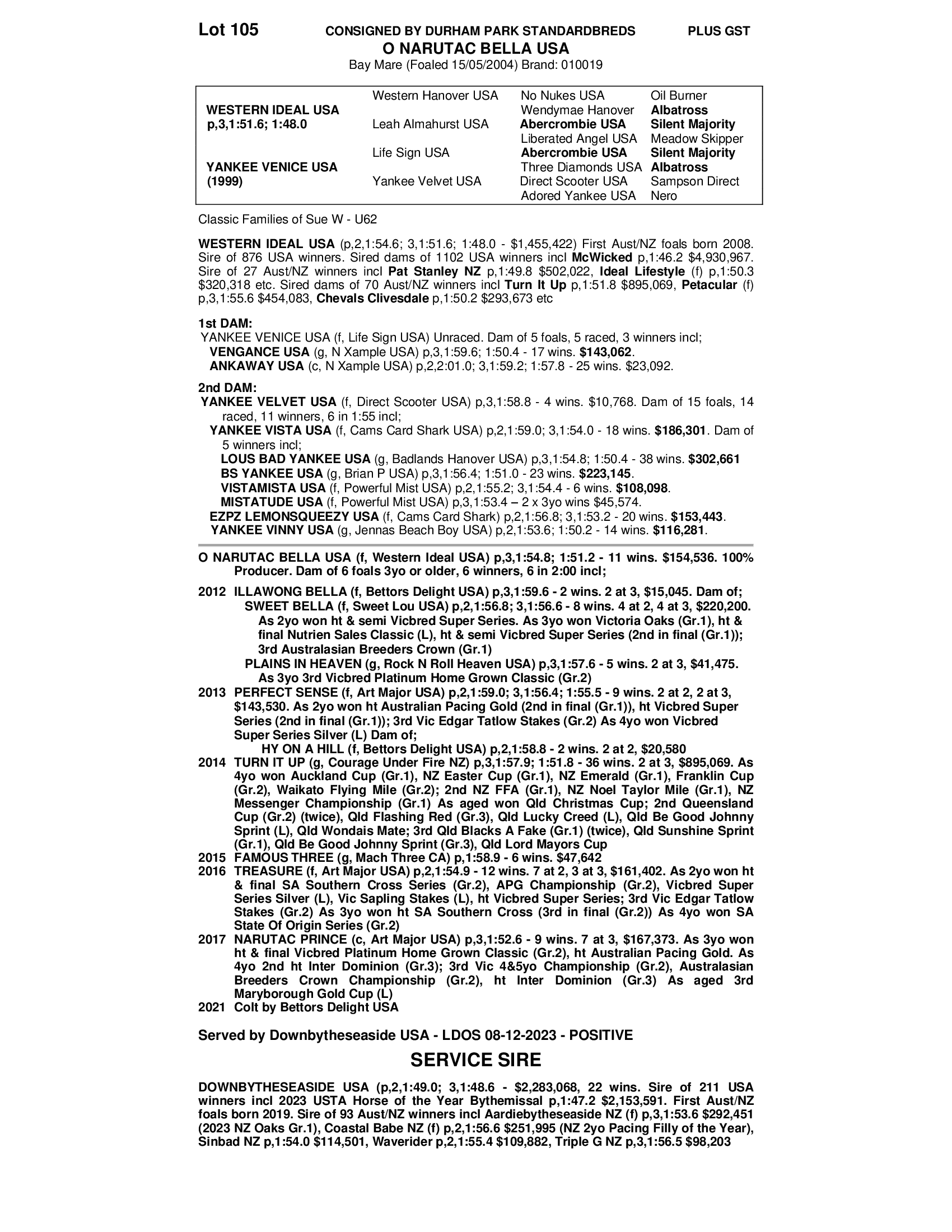 Imported USA mare by WESTERN IDEAL, standing 16.2 hands. She had 11 wins and earned $154,000 with a mark of 1.51.1. She was a very tough Meadowlands racer , and retired early after a paddock accident. Dam of six foals, for six winners including multiple GRP1 placegetter, PERFECT SENSE,1:55.5, career 22.8.5.6, $143,530, multiple GRP1 winner TURN IT UP, 1:51.8, career 84:36:31, $894,569, TREASURE, $161,402, and NARUTAC PRINCE, $167.373.