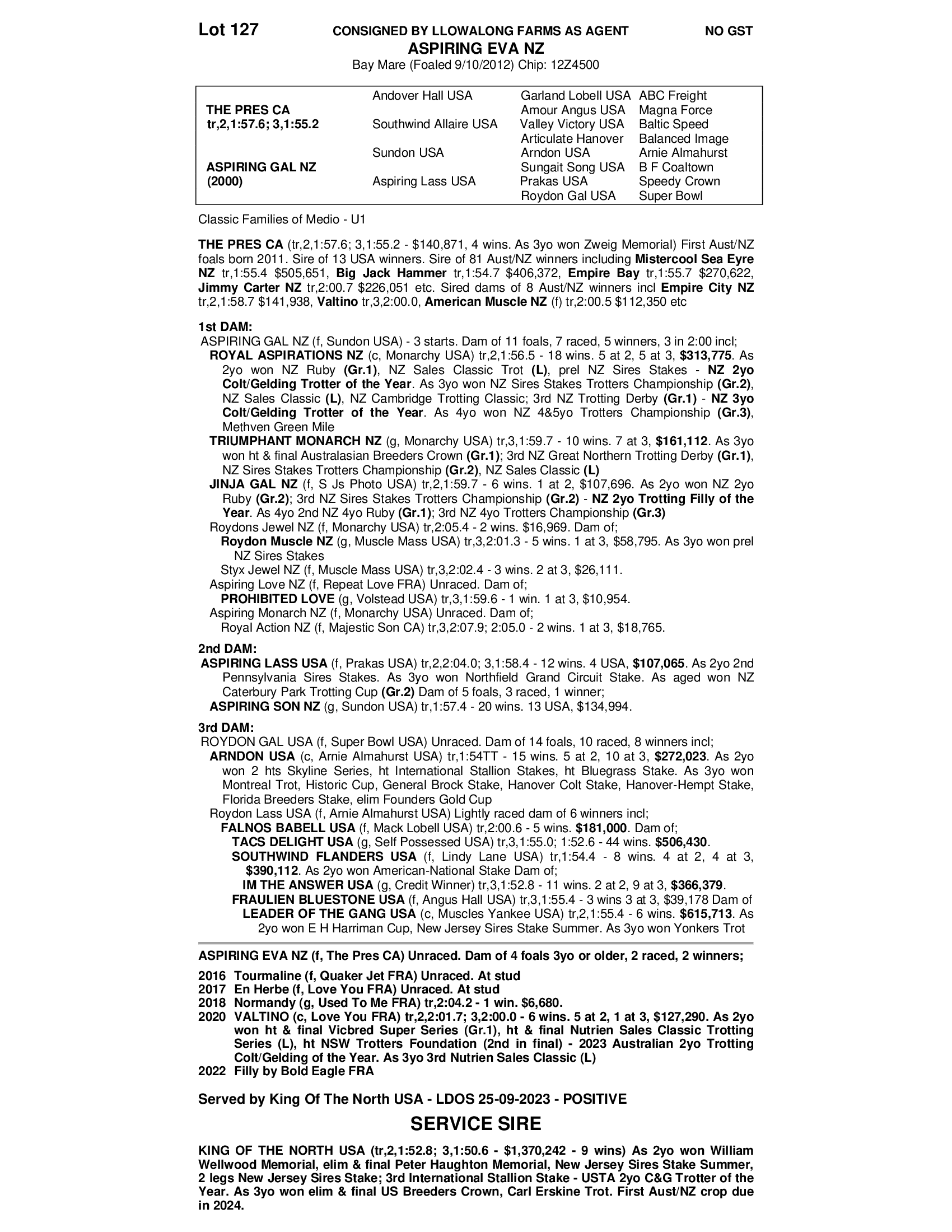 Aspiring Eva --- Broodmare Positive in foal to King Of The North -- LDOS 25/ 9/2023. Service fully paid
