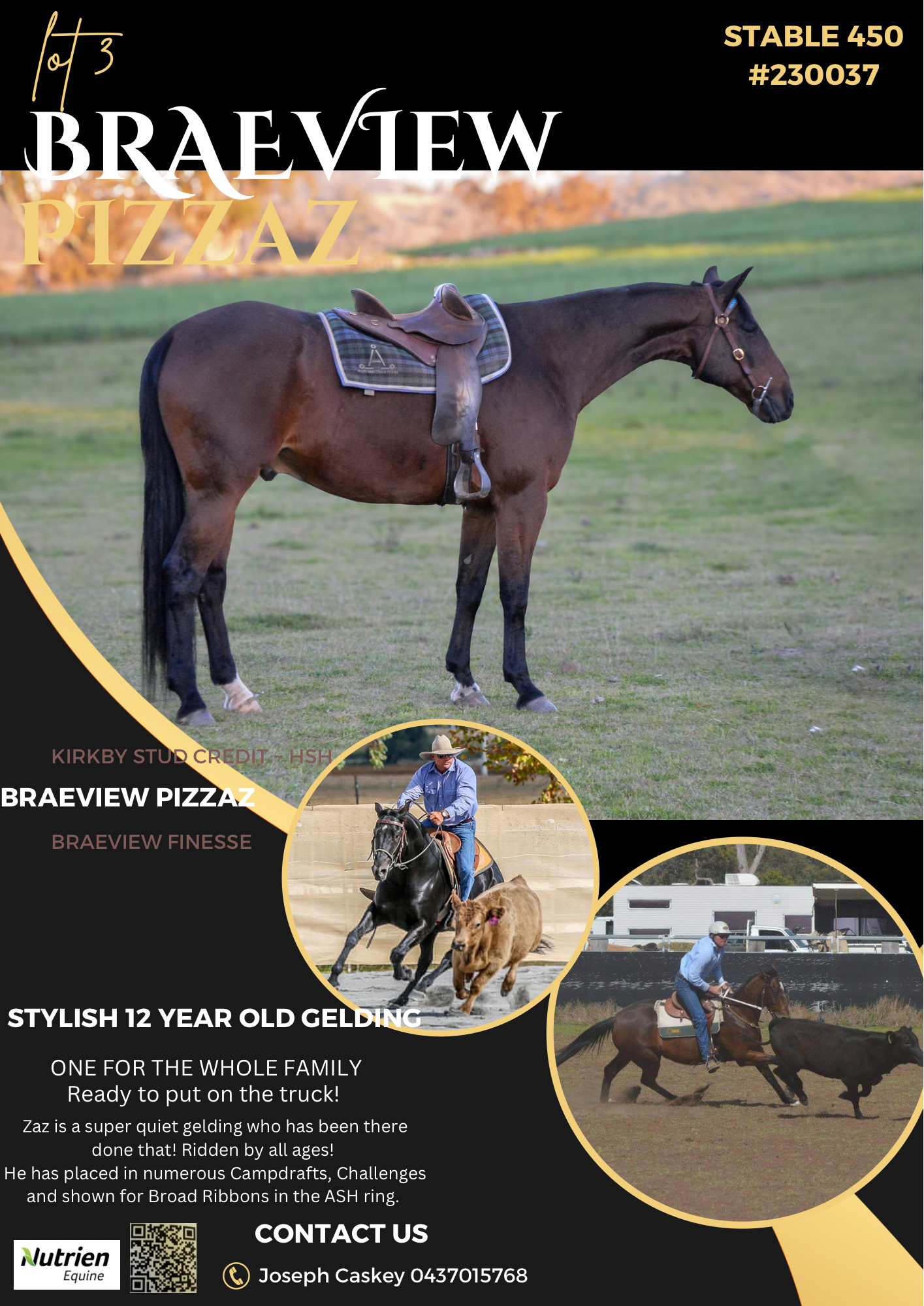 Very rare opportunity to purchase a horse who is truely one for the whole family! Impressive bay 12-year-old Australian Stock Horse Gelding. Zaz has been there done that and has all the miles under his belt. Zaz has established 3 even paces on a collected and loose rein, roll backs and watches/ tracks a beast well. He is well seasoned placing in many campdrafts, challenges and shown for broad ribbons in the ASH ring. Zaz has been ridden by all age groups and all riding levels, would make a super competitive teen/ladies mount with enough in the tank for dad to have a few runs on as well!! Bred in the purple being sired by KIRBYS STUD CREDIT who goes back to Adios reflect, Abby and Abdul. Out of BRAEVIEW FINESSE who goes back to Peppys Doc Bar and Abby just to name a few! Zaz is good to catch, shoe, wash, rug, clip, lead off bike and self loads both into the truck and float. Zaz is athletically built standing approximately at 16 hands and is great after a spell, just get on and go! More photos and videos to come, please contact Joseph on 0437015768 or inbox us for more details.