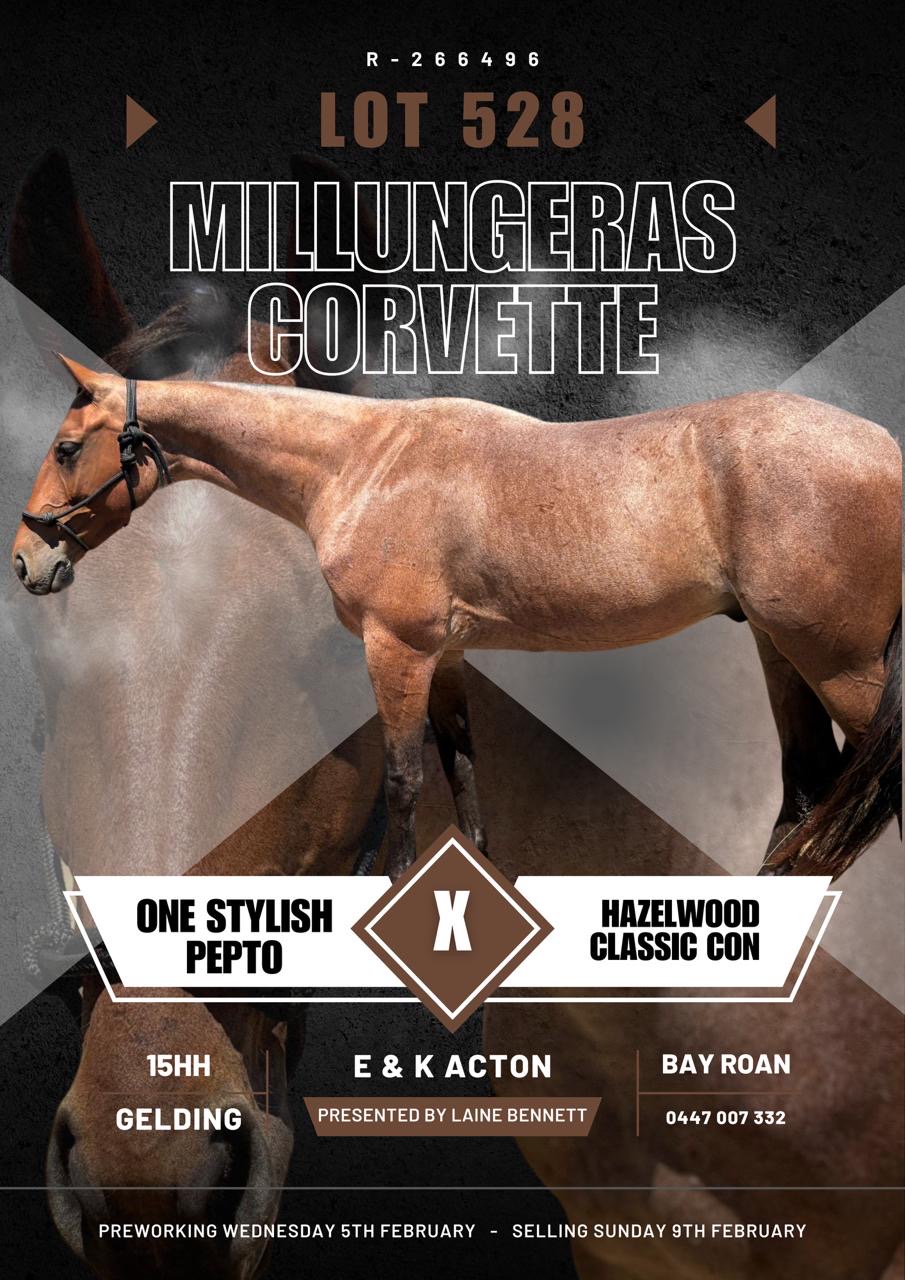 Millungeras Corvette has been at "Millungera" tailing weaners and small turning our jobs. Corvette has been trained by Jason Lindley 0400 914 798 and will be presented by Laine Bennett.