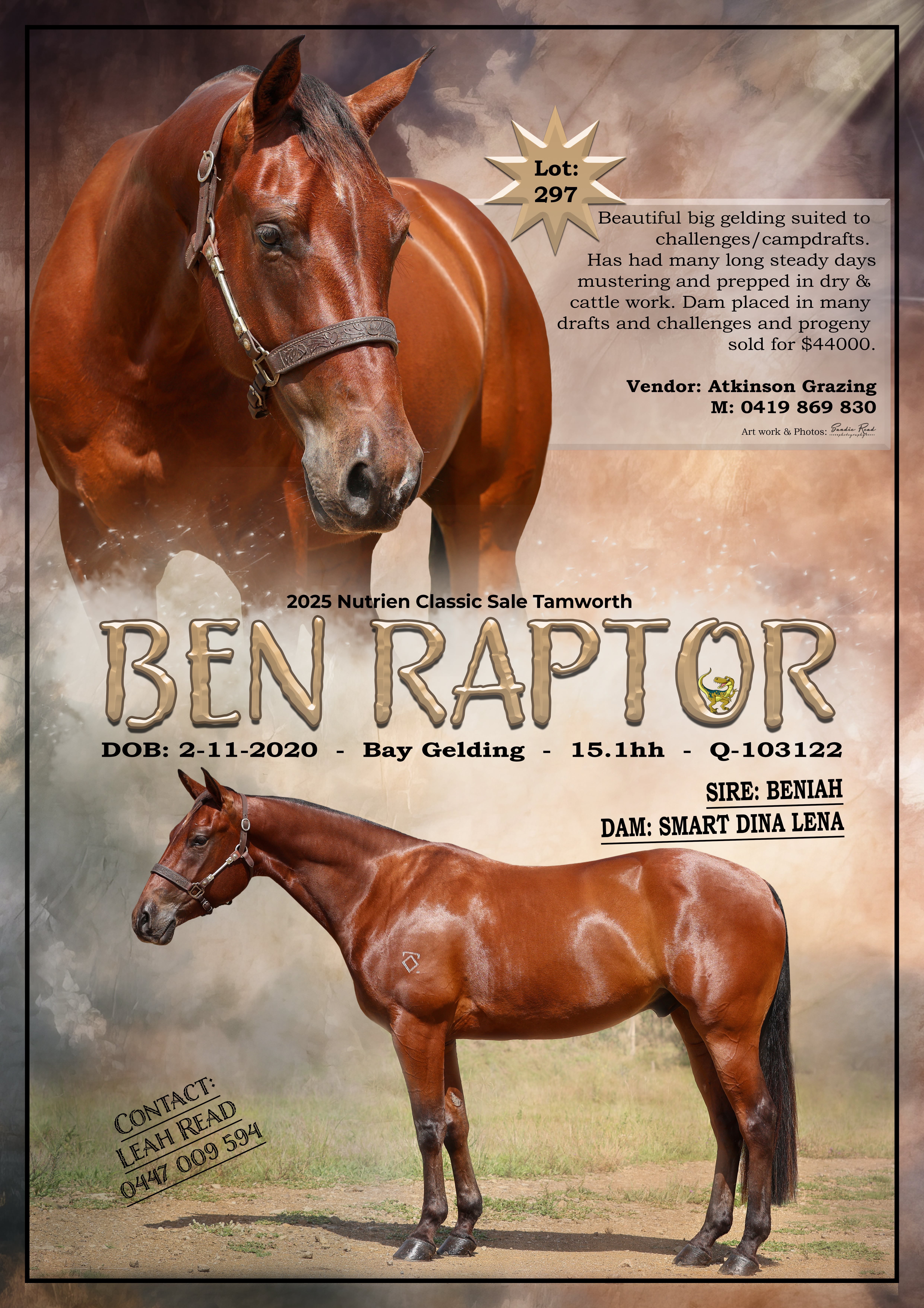 Beautiful big gelding suited to challenges/campdrafts. Has had many long steady days mustering and prepped in dry & cattle work. Dam placed in many drafts and challenges and progeny sold for $44000.