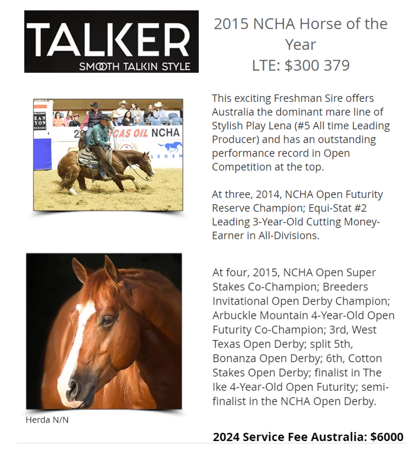 Dam ConAir inaugural Landmark Classic winner, also dam of Conmaze Classic & Graduate winner. Sire SmoothTalkinStyle NCHA futurity reserve champ, NCHA horse of the Year. Outstanding filly, combining all the top qualities to be a top competition & future broodmare.
